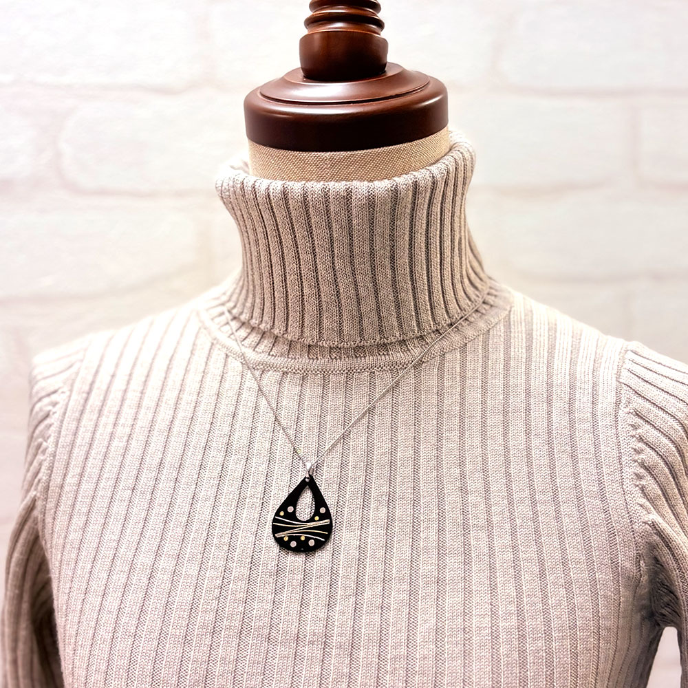 京都の伝統工芸品「京象嵌」のペンダントが胸元をエレガントに演出してくれます。