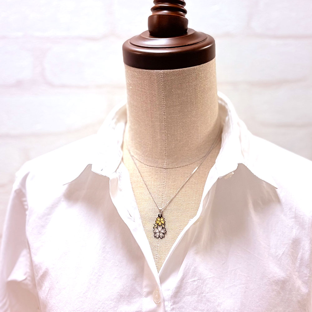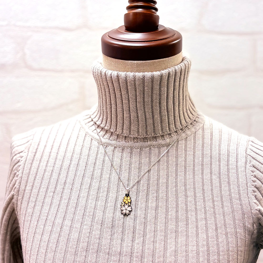 京都の伝統工芸品「京象嵌」のペンダントが胸元をエレガントに演出してくれます。